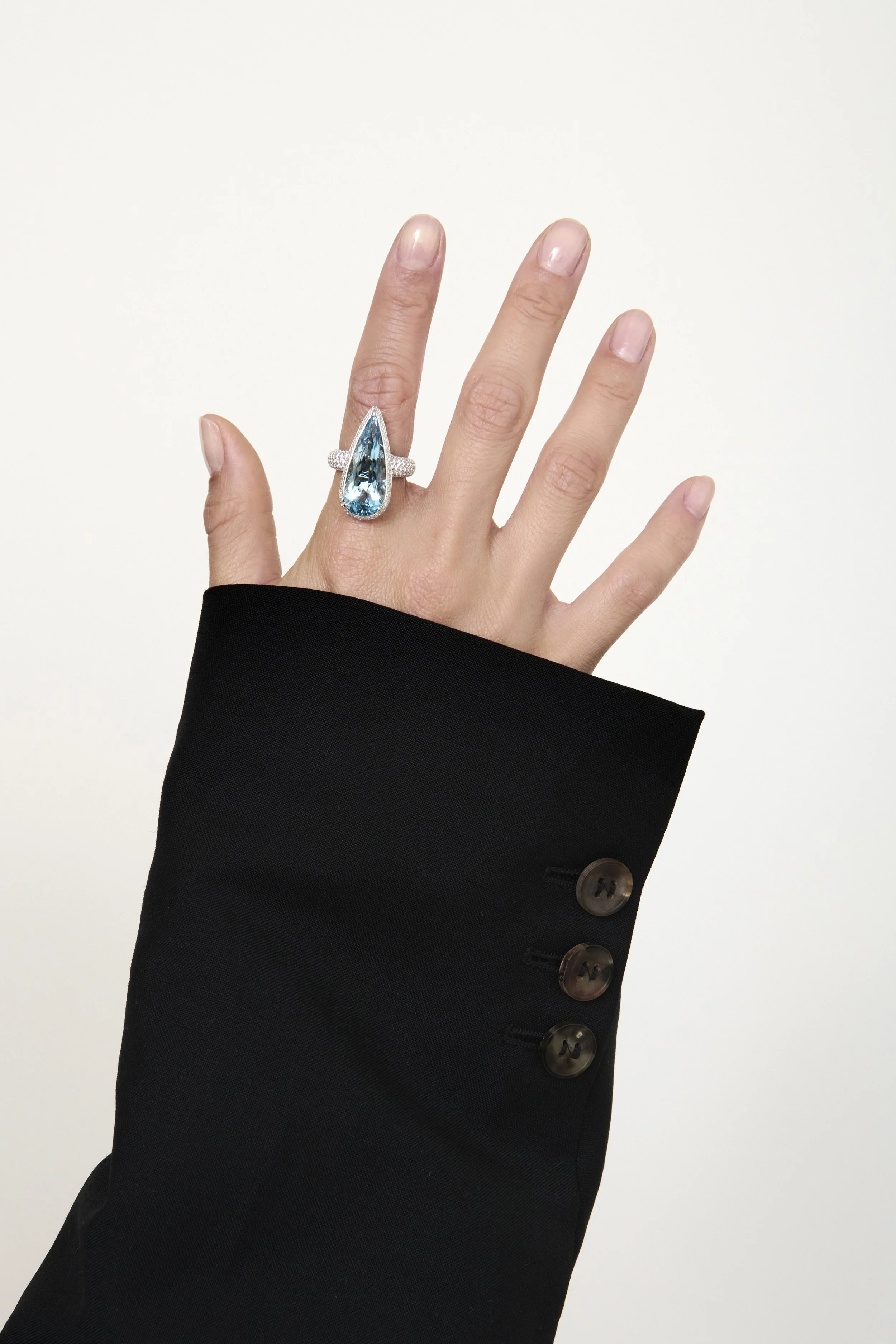 This flawless 7.89ct elongated pear-shaped Santa Maria Aquamarine captivates instantly, its elegant silhouette designed to elongate the hand and draw the eye with effortless grace.